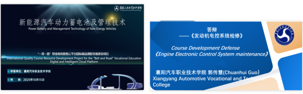 汇报环节严格遵循“8分钟陈述+2分钟答辩”的要求,两位教授聚焦汽车领域课程建设核心要点,结合《PPT陈述材料》(中英双语)关键内容展开详细阐述。郭传慧教授以发动机电控系统为核心汇报方向,从教学模块设计、故障诊断案例本土化改编、实操考核标准制定等方面切入,重点呈现课程如何结合沿线国家主流车型电控系统特点,既覆盖国际通用诊断技术,又融入区域车型维修实操经验,确保学员能直接对接当地就业场景,充分体现课程国际适用性与实践指导性;李兆平教授则紧扣全球汽车产业电动化趋势,以新能源汽车动力蓄电池及管理技术为核心,通过演示动力蓄电池检测虚拟仿真系统、还原管理模块故障模拟实训案例,直观展示课程数字化视频资源建设详情与技术创新亮点,有效解决线上课程“重理论、轻实践”的局限,凸显课程内容专业性与技术融合度。