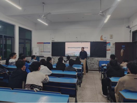 为推进助力学生成长工程,强化学生专业技术能力发展意识,进一步加强“以赛促学、以赛促教”的教育理念,烘托专业竞赛氛围。2025年11月4日,软件技术专业召开“第十七届蓝桥杯全国信息技术全国大学生软件和信息技术大赛”动员会暨备赛启动会,软件技术专业意向学生及全体教师参与,会议由软件技术教研室主任李腾飞主持。